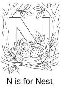 Use the coloring pages to play phonics games. Say the N sound together, clap when you hear it, or find N in storybooks. Trace the letter N on each sheet, or cut out N-shaped paper for decorating. Build a ‘Letter N Book’ by stapling the pages together and practicing the sound every time you flip through. Making letter crafts (like a nest collage with real twigs) strengthens fine motor skills and cements the connection between the letter, its sound, and its meaning.