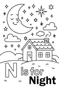 Inside this pack, you’ll discover playful coloring sheets featuring a nest, a narwhal, a ninja, a nose, and a magical night scene. As your child colors, they’ll hear the gentle ‘nnn’ sound, practice saying new words, and develop early reading skills. Let’s get to know the letter N together—one colorful page at a time! Check out more letter coloring with our M-R letter bundles.