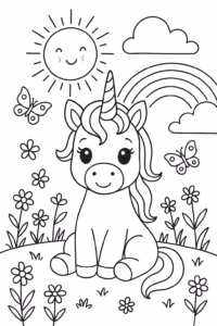 5. Unicorn & Rainbow: No Unicorn coloring sheet is complete without a magical rainbow. Our unicorn is sitting in a meadow at the end of a rainbow