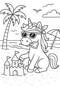 2. Unicorn at the beach: Looking cool for summer, our unicorn is soaking up the rays in this beachside coloring in canvas.