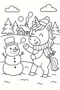 1. Unicorn in the Snow: Enjoy coloring our wintry scene of a unicorn playing in the snow.